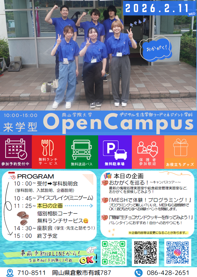 JR倉敷駅から 交通アクセス 受験生の方へ 学校案内パンフレット 令和8年度総合型選抜(対話型)入試ガイド 令和8年度学生募集要項 お問い合わせ先 岡山学院大学・岡山短期大学入試事務室 LINE:@157iinup MAIL:nyushi@owc.ac.jp TEL :086-428-2651