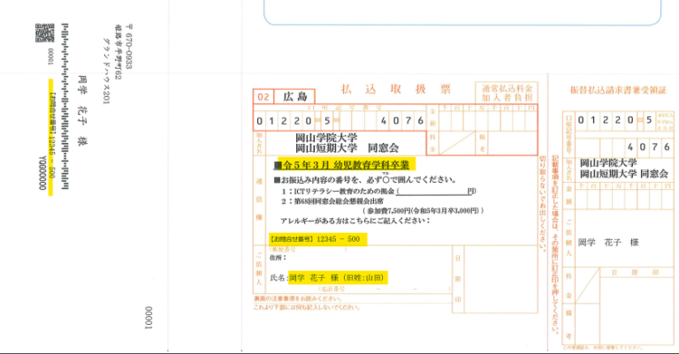 お問い合わせの際は、【お問い合わせ番号】【お名前】【卒年】【学科】を添えて