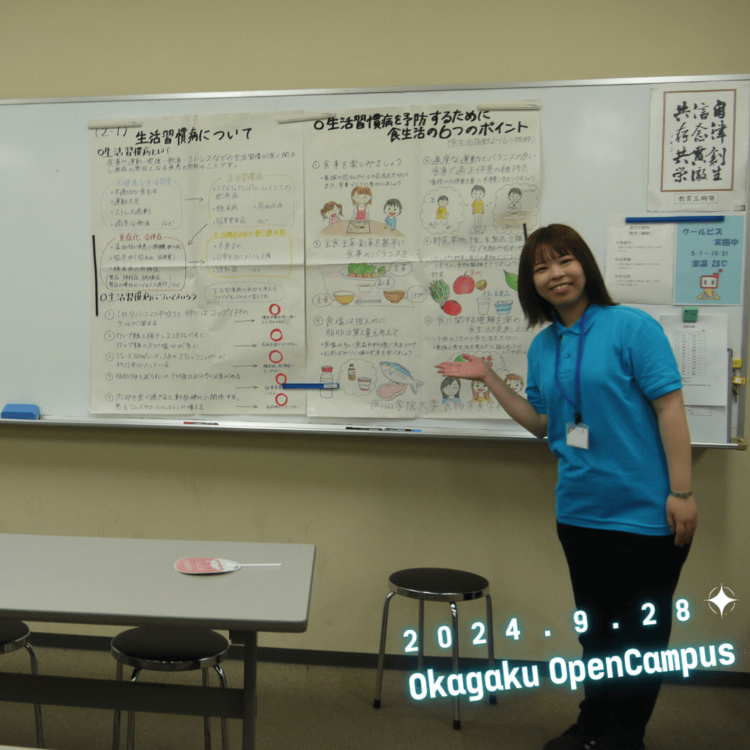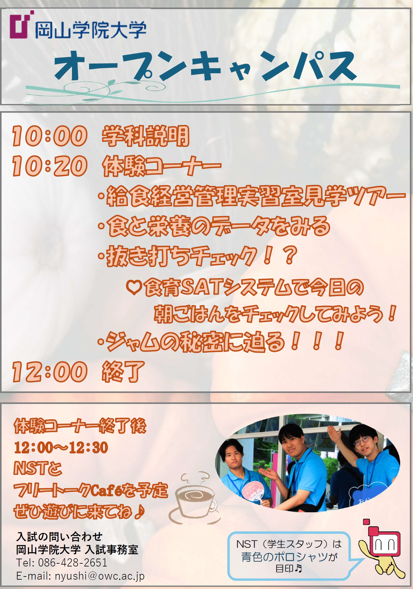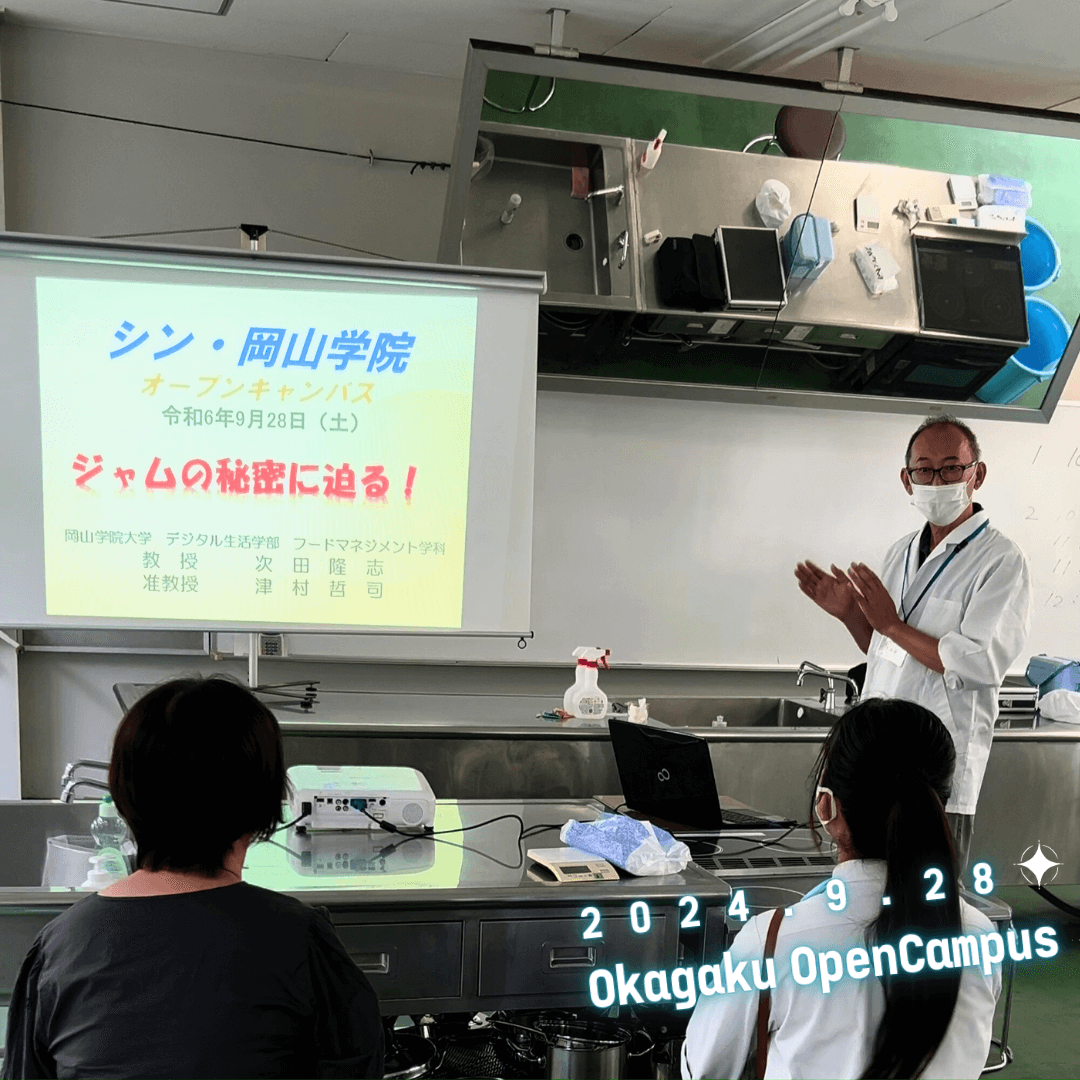 過去のOC(岡山学院大学)【終了しました】9/28(土)来学型オープンキャンパス2024.09.28 す 参加者からのご感想 ・実際に体験してみて、楽しかったです。 ・ジャムのひみつがおもしろかったです。 ・学生の方も先生方もとても温かく、いい学校だなと感じました。また参加させていただきたいです。