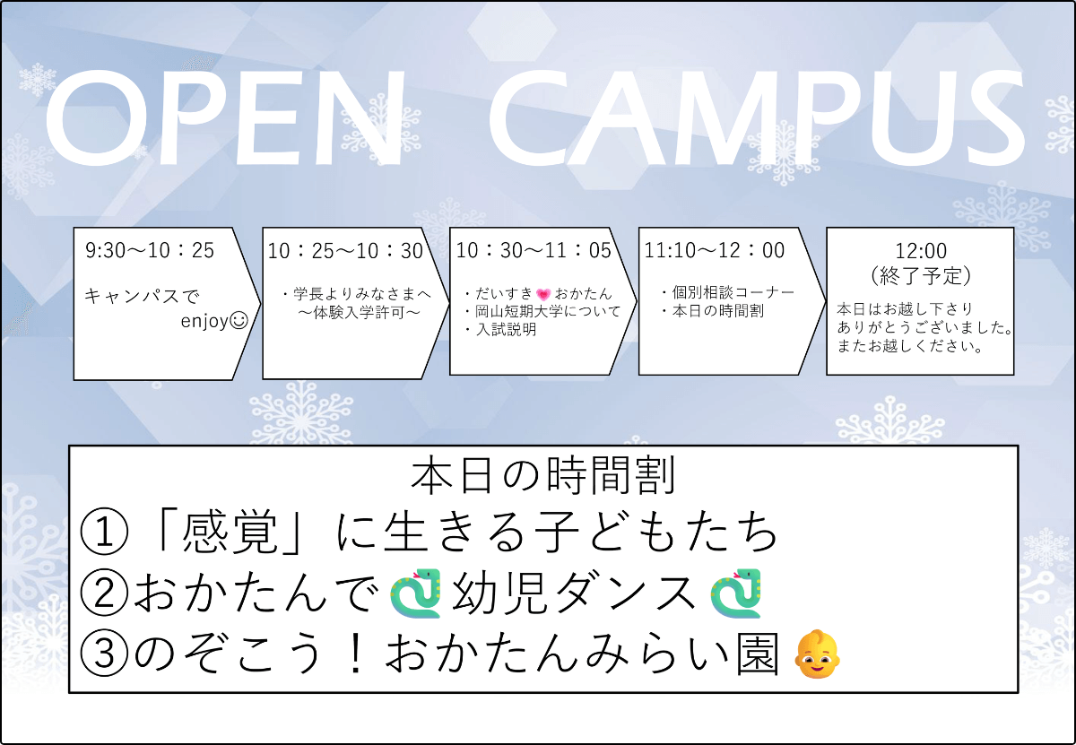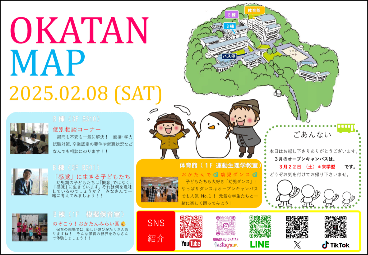 ・実際見学してみたかったおかたんみらい園での子どもたちと在校生の様子をみれてうれしかった。とても充実したオープンキャンパスになりました。
