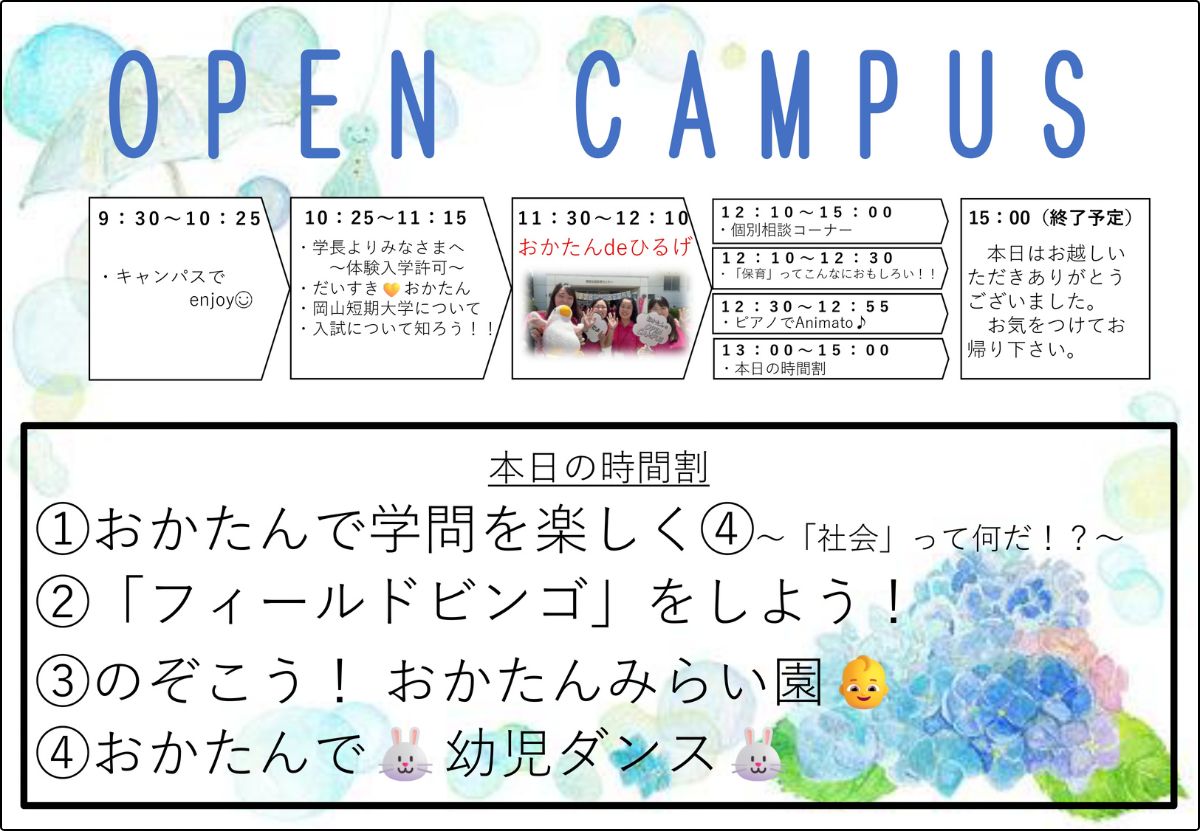 ・大学のOCにはあまり参加したことがなかったのでよい経験になりました。保育関連は今まで興味を持っていませんでしたが、体験コーナーで実際に保育を体験できたのがすごく新鮮で良かったです。