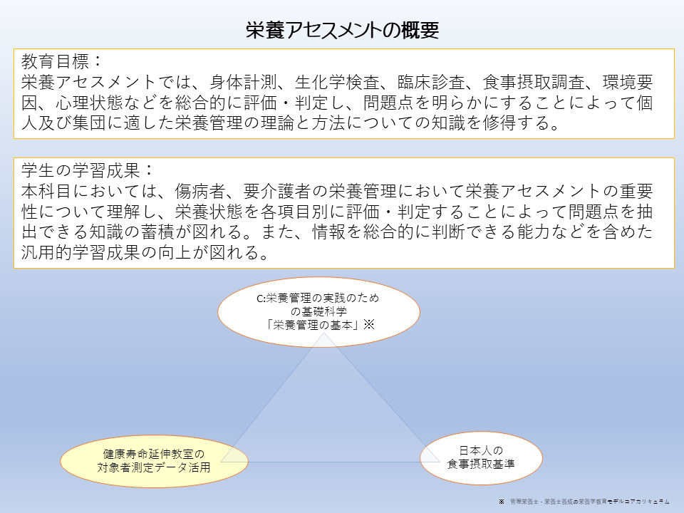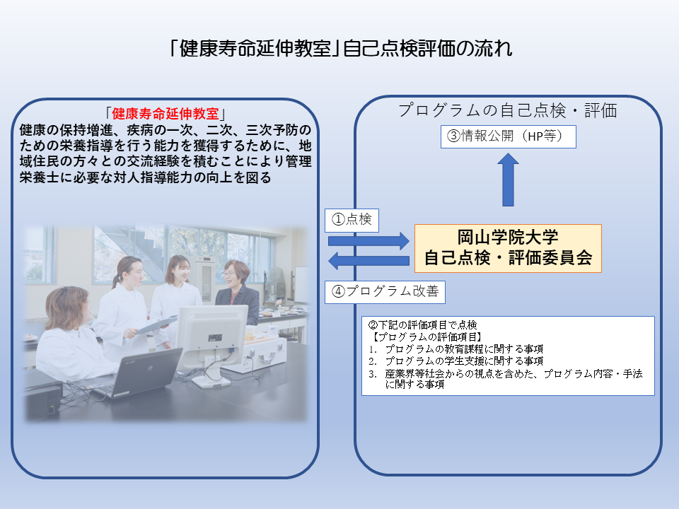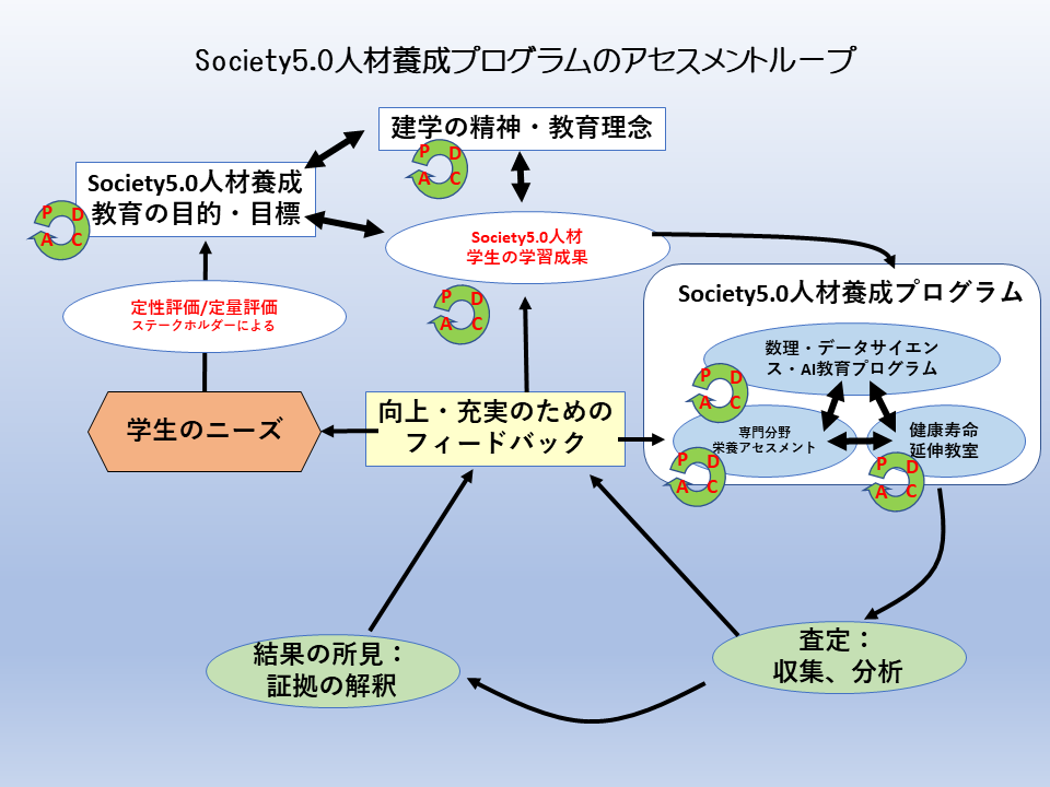 「Society5.0人材養成プログラム」は、Society5.0社会の現場に即応する管理栄養士として活躍するための学生の学習成果を獲得する本学独自のプログラムです。具体的には、健康寿命延伸教室で取得した対象者の測定データ(以下、測定データ)を活用し、数理・データサイエンス・AI教育プログラムで測定データの作成・蓄積・分析を行っています。また、専門分野「栄養アセスメント」で測定データを応用します。アセスメントループに従って点検・評価・改善を図っています。さらに、データ分析の結果は、倉敷市老人クラブ連合会の報告するなどで地域社会への還元していきます。