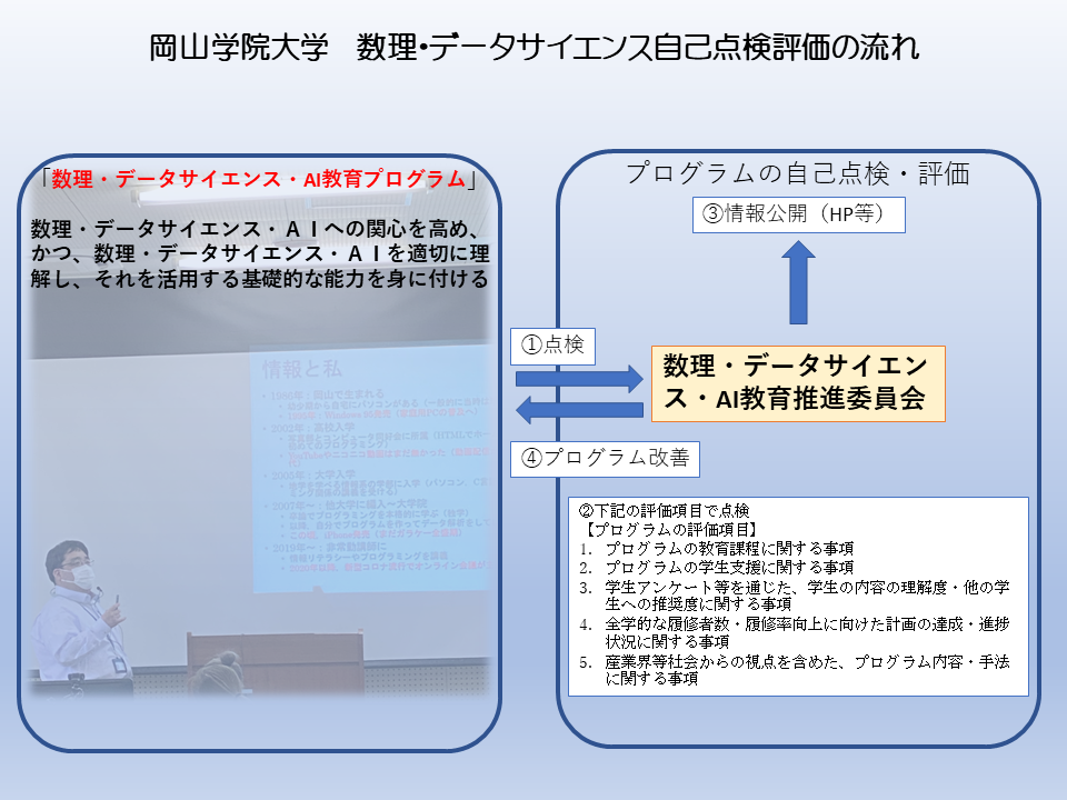 岡山学院大学デジタル生活学部では、令和3年度から「数理・データサイエンス・AI教育プログラム」(令和7年度より「食と栄養のデータサイエンスプログラム」)を実施しています。学生の数理・データサイエンス・AIへの関心を高め、かつ、数理・データサイエンス・AIを適切に理解し、それを活用する基礎的な能力を育成すること及び数理・データサイエンス・AI活用して課題を解決するための実践的な能力を育成する教育プログラムを全学的に実施することを推進するために数理・データサイエンス・AI教育プログラム推進委員会を配置し、全学生が修得できる教育プログラムを実施しています。