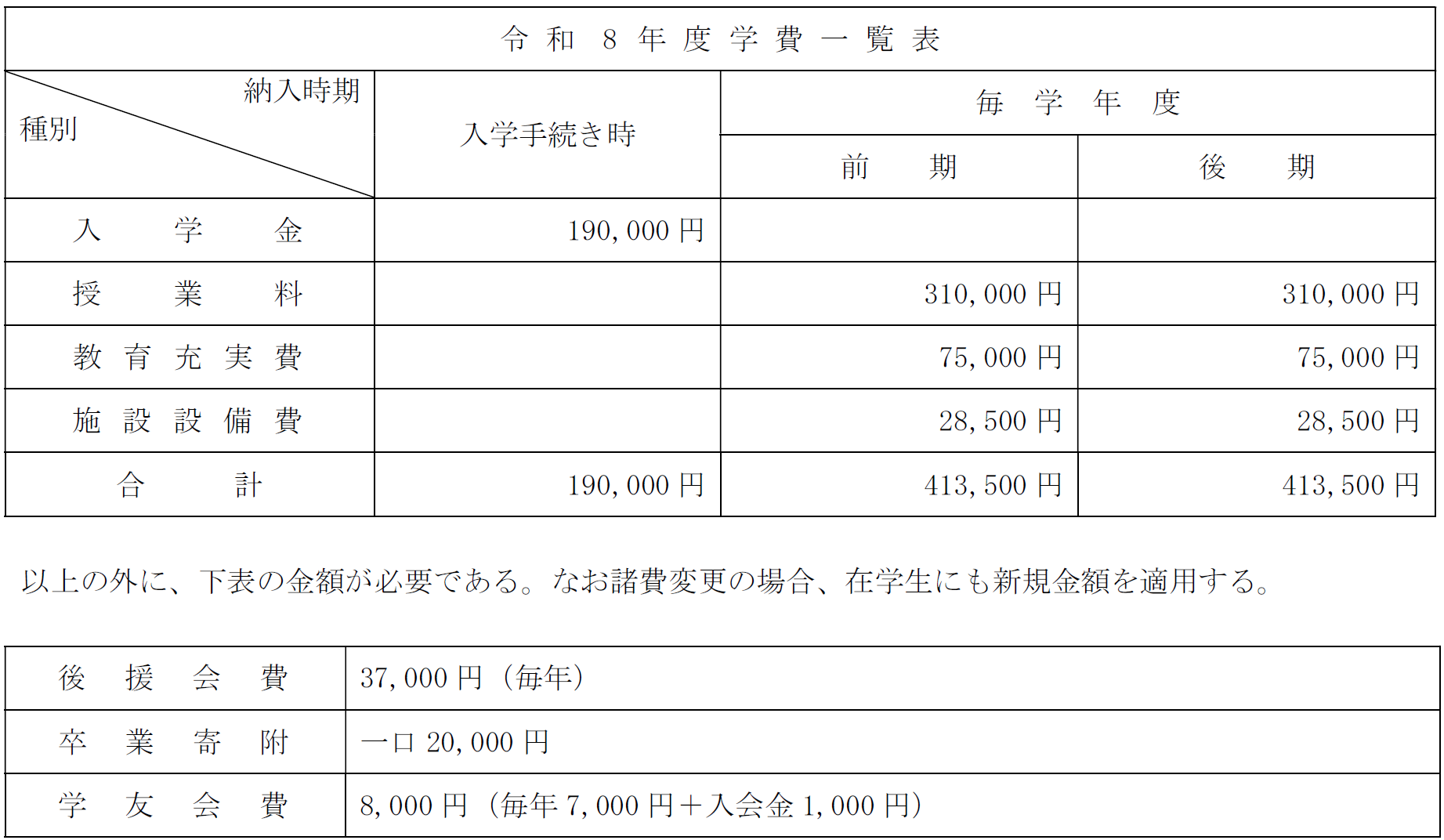 ただし、入学手続き時の学費納入期限は募集の日程に示す入学手続き締切日とする。